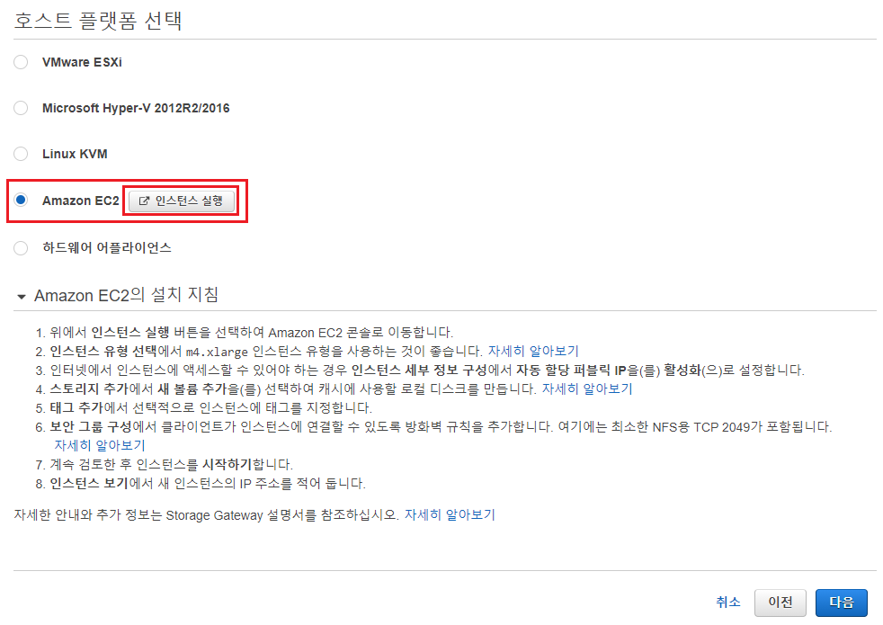 * 사용 인스턴스는 Storage Gateway 역할 수행에 필요한 특정 기능이 필요하므로, "인스턴스 실행"을 통해 새로운 인스턴스를 제작 권장