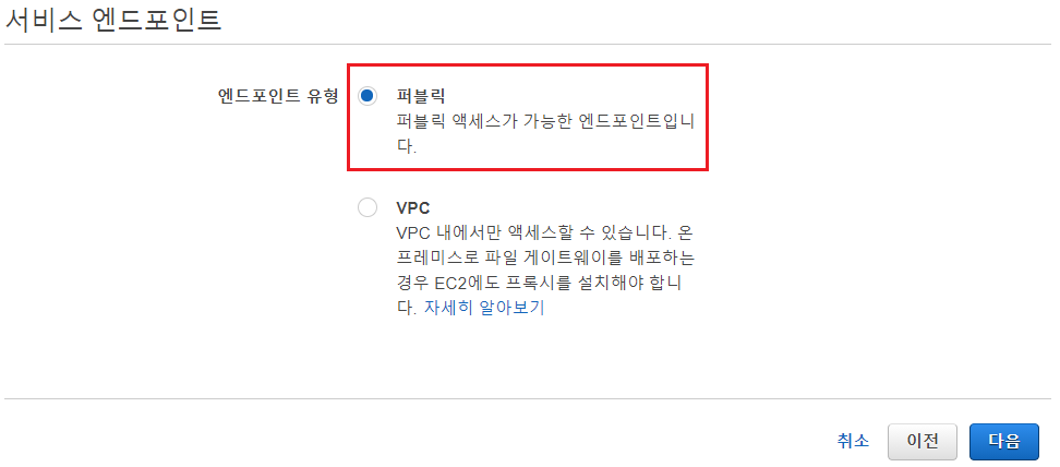 * 퍼블릭: 게이트웨이가 인터넷을 통해 AWS 스토리지로 연결
