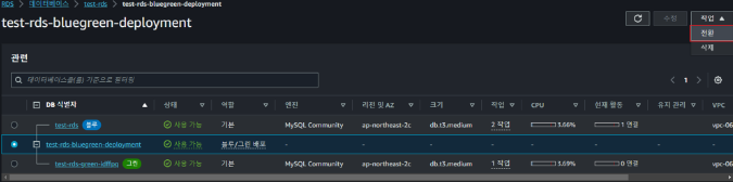 앞서 생성한 RDS의 작업 탭에서 블루/그린 배포 생성을 선택합니다.