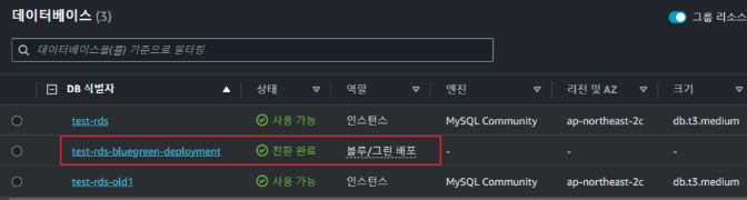 이후 시간이 흐르면 Deployment RDS의 상태가 "전환 완료"로 변경되고, RDS들의 식별자가 변경됩니다.